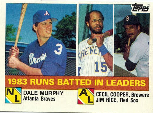 You clearly see with these RBI leader cards that I'm not great at scanning. It's somehow hard for me to always get the cards straight when they're on the scan bed. I think I've improved at this, but I scanned these Cecil Cooper cards a while ago. If you ignore the crookedness, you see that Cooper led the AL in RBI in 1980 and in 1983 (tied with Jim Rice in 1983). The NL was led by Mike Schmidt in 1980, so the 1981 card now lives in my Schmidt player collection.